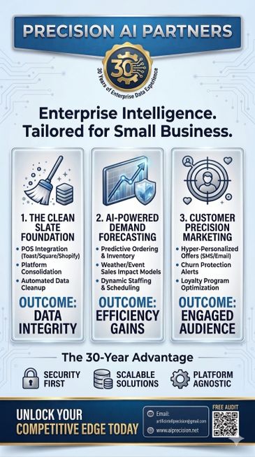 We founded AI Precision to bridge the gap. Our goal is to provide small businesses with a unified, AI-powered platform that simplifies diverse datasets into actionable growth. From predictive demand forecasting to precision marketing campaigns, we provide the tools and the "big-picture" advantage you need to gain efficiency and truly engage your audience.